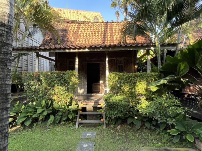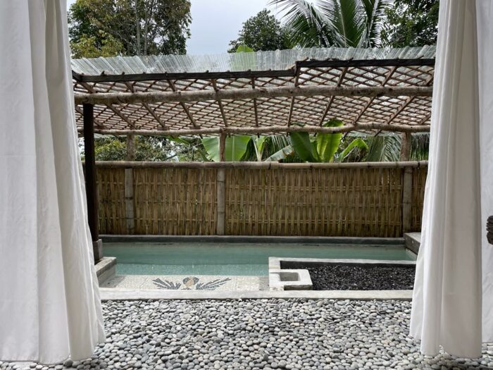 No, upřímně vám řeknu že mezi námi a touto chatkou se žádná láska nezrodila. Šlo o typickou, architektonicky nelogickou dřevěnou chajdu na betonových sloupkách bez oken, uprostřed s postelí a děravou moskytiérou. Později jsme zjistili že bylo několik děr i v podlaze. A v této části Bali vám rovnou řeknu že to prostě NECHCETE… Chodili jsme sem opravdu jen spát. Nenechte se zmást fotkami na webu, pokud nechcete, aby vám krysy běhali po střeše, nebo abyste potkali švába na podlaze, neubytovávejte se tu. Okolí bylo ale docela ucházející. Chatky se nacházeli v zahradě, na jejímž konci bylo jezírko, jógová šala, malá modlitebna a soška Ganeshi. Na druhé straně, směrem k hlavní cestě byl bazén. Záchrana. Hned první den, po zážitku v polích, jsme do něj s chutí skočili.