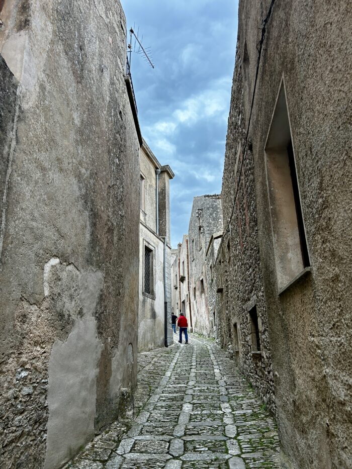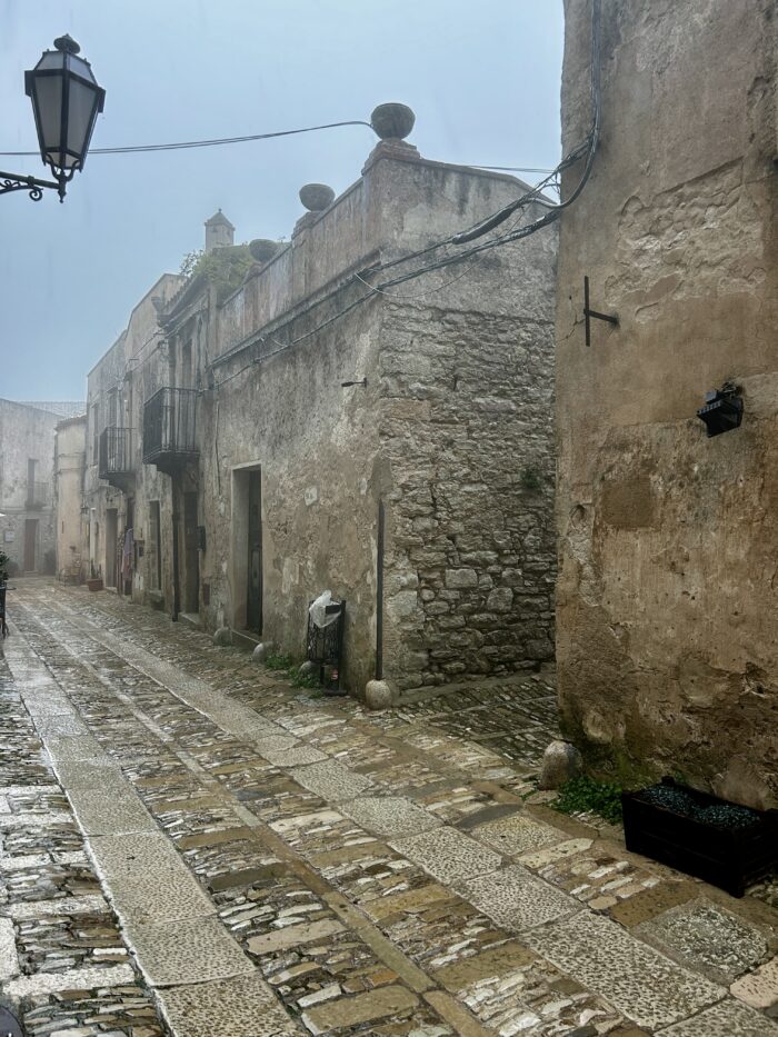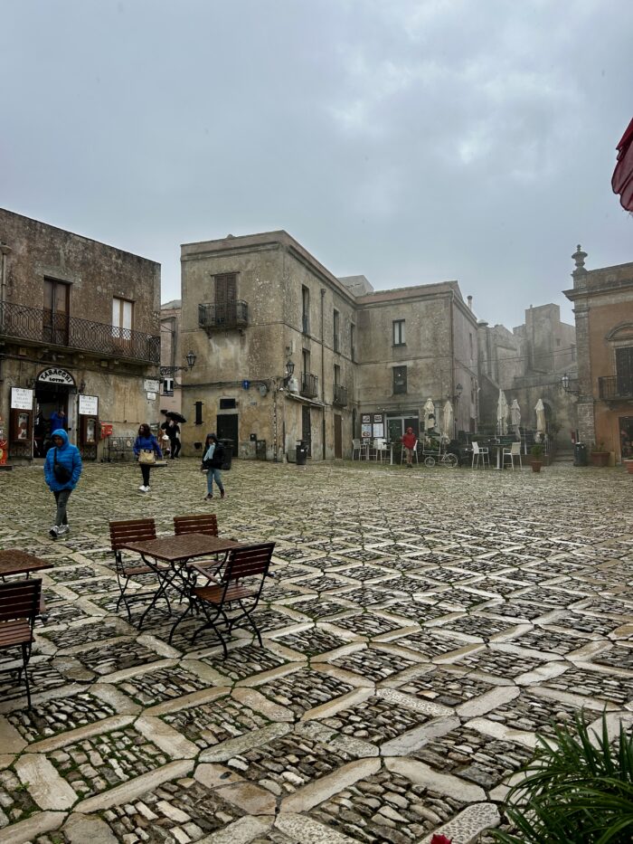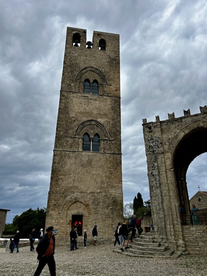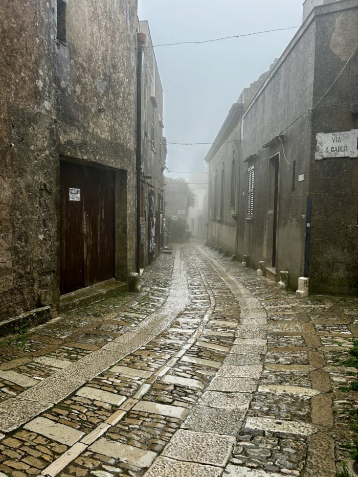 Na dnešek jsme měli původně naplánovaný výlet lodí na Egadské ostrůvky v čele s Faviognanou, kde se nachází překrásná příroda a pohádkové pláže, ale po nočním dešti je stále zataženo, poměrně chladněji a na opalování to rozhodně nevypadá. Po snídani tak namísto k přístavu zamíříme na pět kilometrů vzdálenou lanovku, která Vás za 5,5 eura na osobu vyveze do horské vesničky Erice. Ta je beze sporu jedním z hlavních lákadel Trapani. Vyjma lanovky se nahoru na horu dostanete autobusem, nebo taxíkem. My se těšili na lanovku a nabízené výhledy. Chladno je na dlouhý rukáv a těžká mračna dávají tušit, že déšť se ještě nevzdal. Čím blíže nástupové stanici jsme, tím více se zatahuje a zvedá vítr. V pomyslném cíli zjišťujeme, že lanovka aktuálně pro nepřízeň počasí nejezdí. Vítr je moc silný.  Za normálních okolností bychom to nahoru došli, ale do deště to nestihneme. Jsme lehce rozladění. Druhý plánovaný výlet, na který se od zakoupení letenek těšíme a nevyjde ani ten. Ve chvíli, kdy se rozhodneme vrátit na nás zavolá dvojice, která měla evidentně stejný nápad. Domlouvají taxi a další dva spolucestující by se jim hodili. V mžiku souhlasíme a necháme se za 20 euro vyvézt transitem až před brány vesničky. Během půl hodinky jsme v nadmořské výšce 750 m. n. m. Mrholí. Jak já jsem ráda za koženou bundu v batohu. Město má bohatou historii, jež sahá až hluboko do antiky. V minulosti patřilo mezi přední elymská města. (Pozn. Elymové – starověký národ obývající západ Sicílie). Později sloužilo jako Kartaginská pevnost. Ač je městečko malinkaté, památek je tu nesčetně. Mezi nejvýznamnější patří Kyklopské zdi, Normanský hrad Castello di Venere, Kostel Nanebevzetí panny Marie – Chiesa Madre. Kostely a paláce, ale najdete takřka na každém kroku.